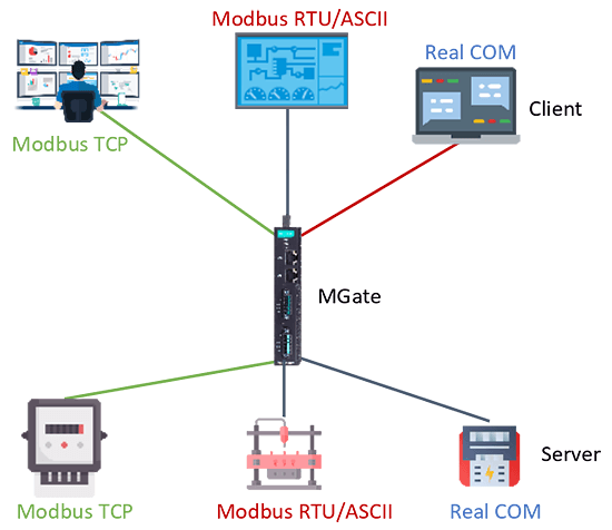 При первоначальном подключении шлюзы серии MGate MB3000-G2 сразу готовы к преобразованию Modbus RTU/ASCII в Modbus TCP и не требуют дополнительной настройки. Также устройство поддерживает одновременное преобразование Modbus TCP ↔ Modbus TCP, Serial ↔ Serial, а также режим RealCOM*