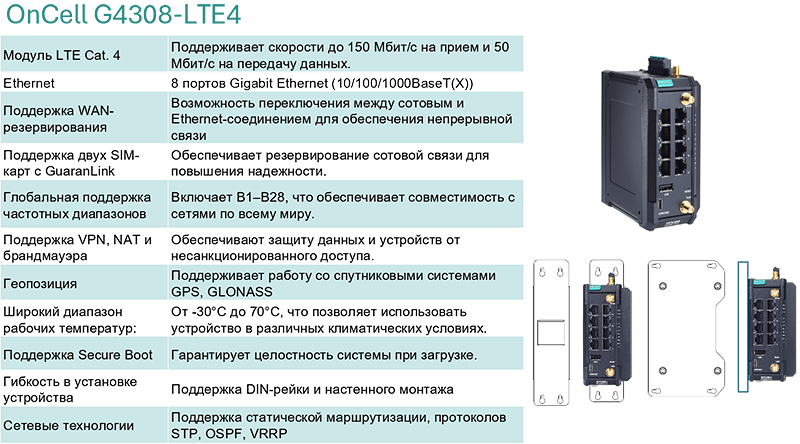 - Встроенный LTE Cat.4-модем с глобальной поддержкой частот (версия GL) — оптимальное решение для международных и распределённых проектов