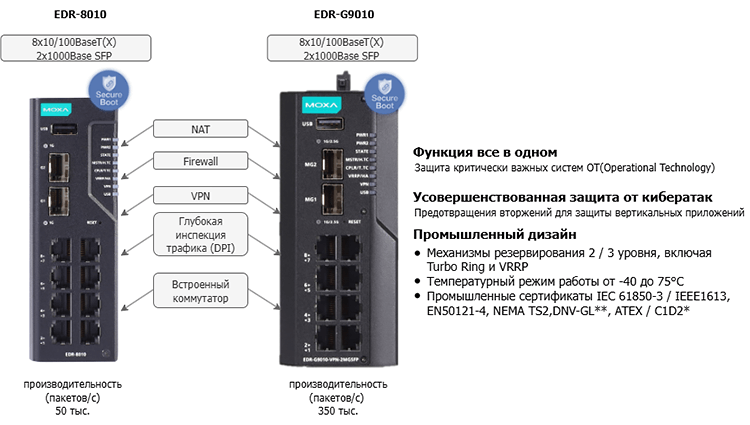 | EDR-8010 | 8x FE Cooper 2 x Gbe SFP | RSTP/Turbo Ring | 50K pps | 50 IPSec Tunnels 200 Мбит/c |