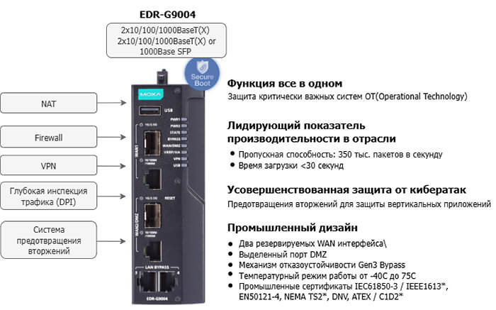 Исходя из растущих требований к оборудованию сетевой безопасности на смену рассмотренным в предыдущей статье маршрутизаторам разработаны новые усовершенствованные модели серии EDR-8010, EDR-G9010, EDR-G9004, которые разработаны в соответствии со стандартом МЭК 62443-4-2 и соответствуют установленным требованиям для применения в промышленных приложениях. Данные устройства представляют собой целый набор механизмов защиты промышленных сетей связи, рассмотренных выше.